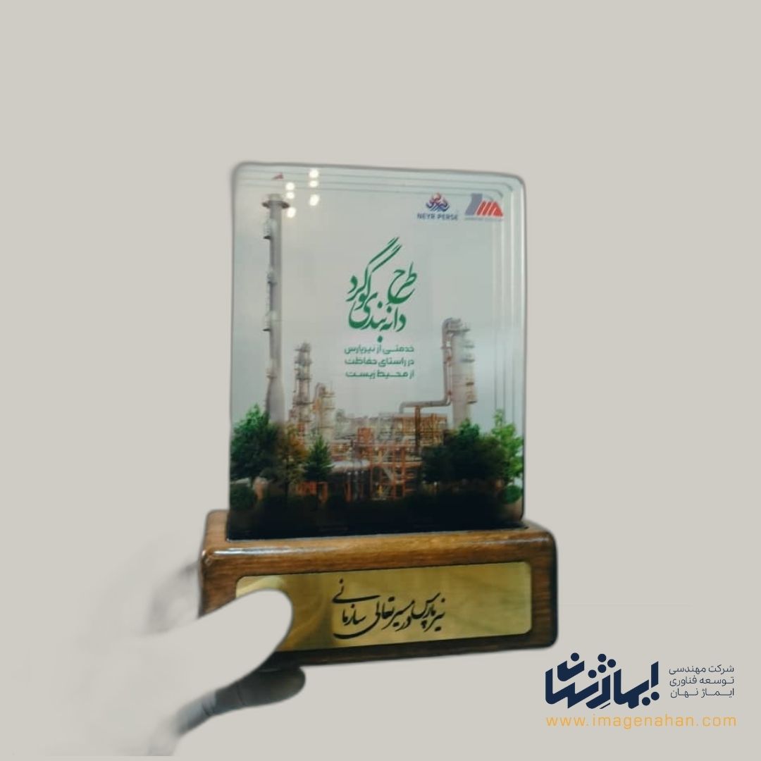 چهار لایه پلکسی با تصویری سه بعدی از واحدهای جداسازی و دانه بندی گوگرد پالایشگاه پارس جنوبی، با پایه چوب راش رنگ شده و پلاک طلایی